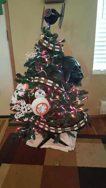 Since River is really into destroying I mean exploring the world around him I thought this tree was the safest bet......no special ornaments to break and nothing that he could hurt! We will see how long it lasts!! Mason was SO SO excited to have a Star Wars themed tree : )